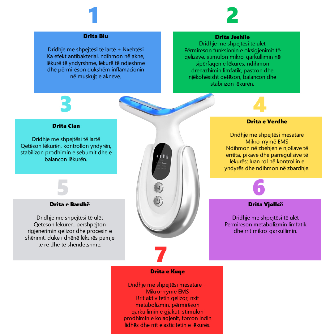 ✔ 7 LED drita: secila me efekt specifik (anti-akne, anti-rrudha, qetësim, zbardhim, lifting)